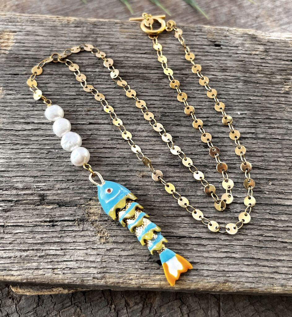 With chain that shimmers like a fishing lure, this necklace has caught a beautiful blue fish.