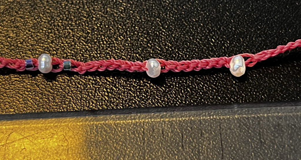Continue creating basic crochet stitches. This image is from another design, but the same technique. Next, push one other pre-strung beads to the base of the loop on your hook. Crochet the next chain as usual over the bead, such that you trap the bead on the back ‘bump’ of the chain.