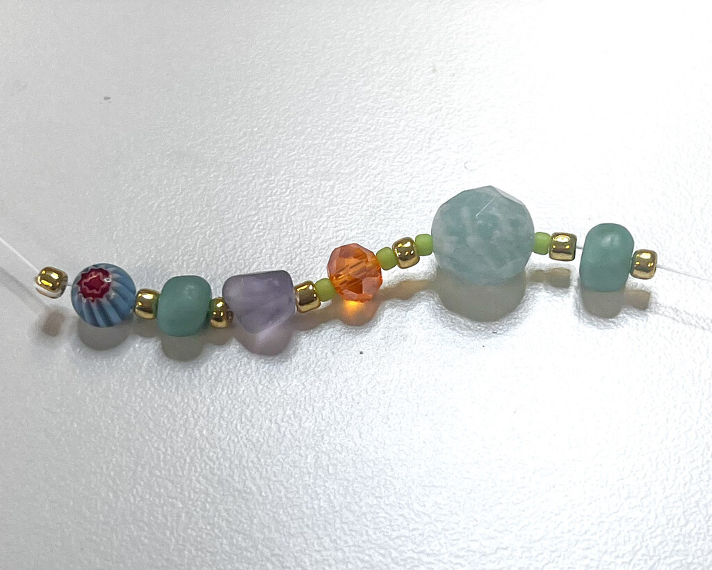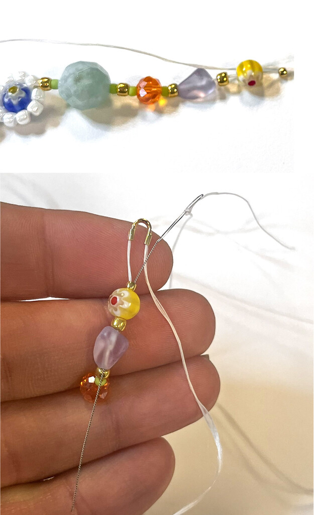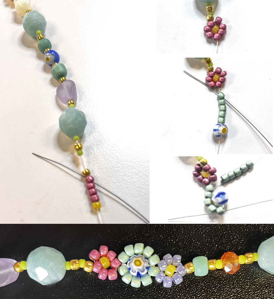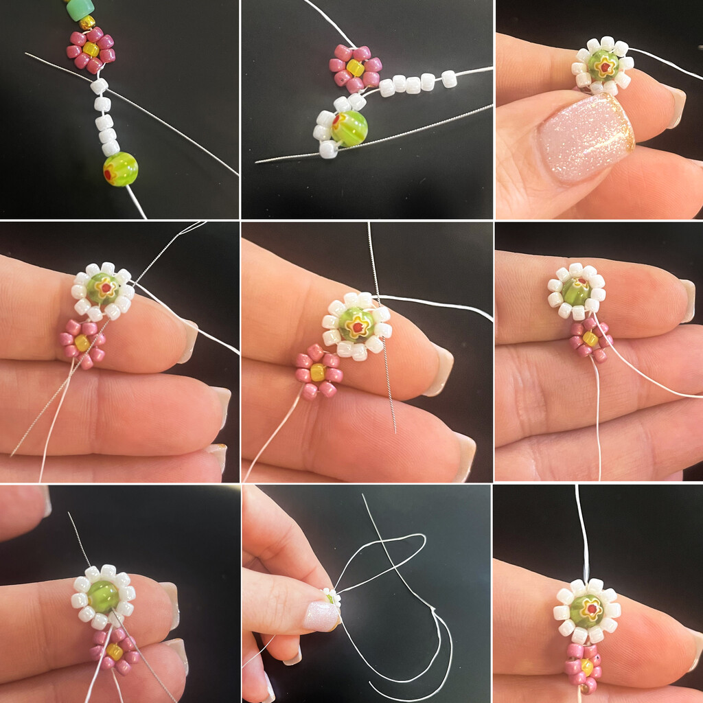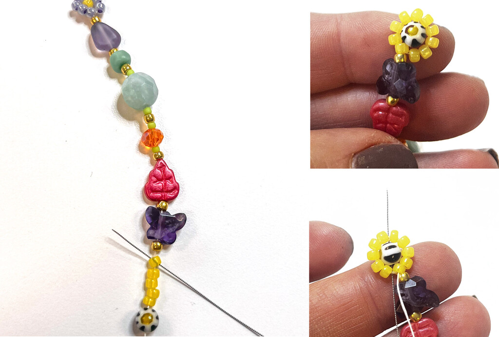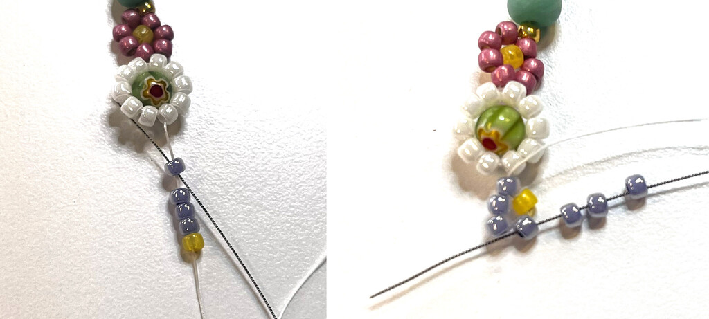 Slide a few more beads as shown. Create one last flower using a Millefiori round and white seed beads.