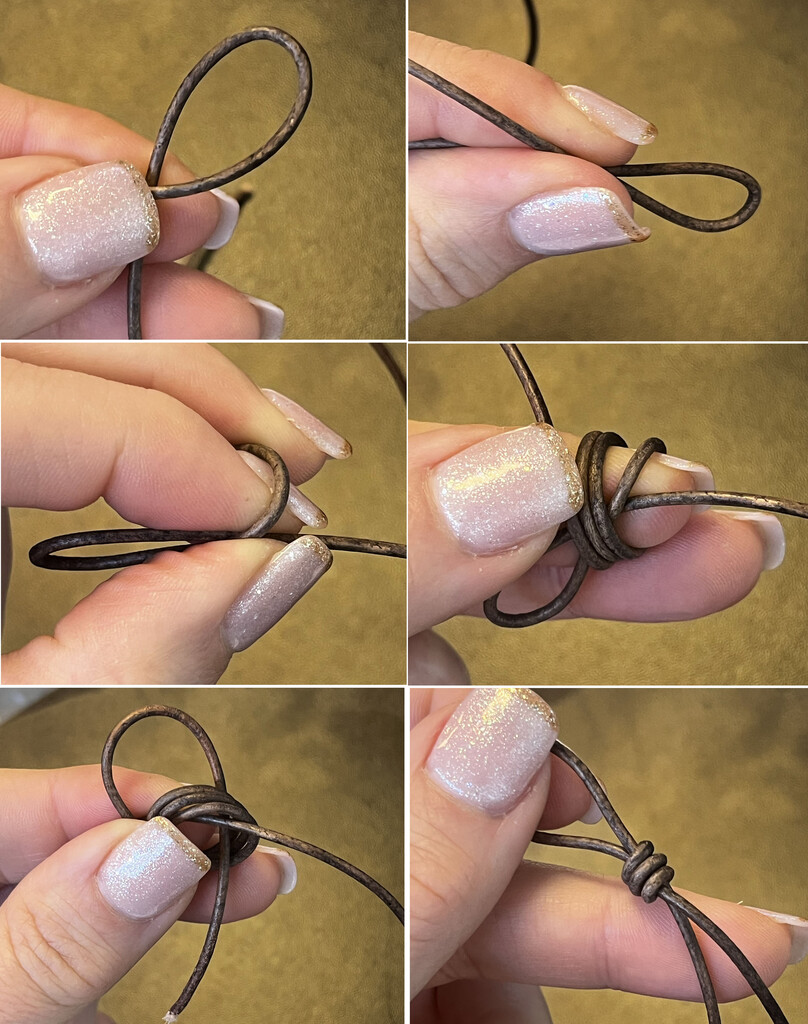 Image 1: Feed one cord end through the button. Image 2: Lay your left index finger on top of the longer cord. Start wrapping the working cord around your finger, moving to the left. The cord should wrap around the cord between your fingers, too. Image 3: Bring the cord around your finger two more times. Image 4: Slide the loops off your finger and bring the working cord down through all of the loops. Image 5 & 6: Pull both cord tails until the knot is very tight and doesn't slip. Trim off the short cord.